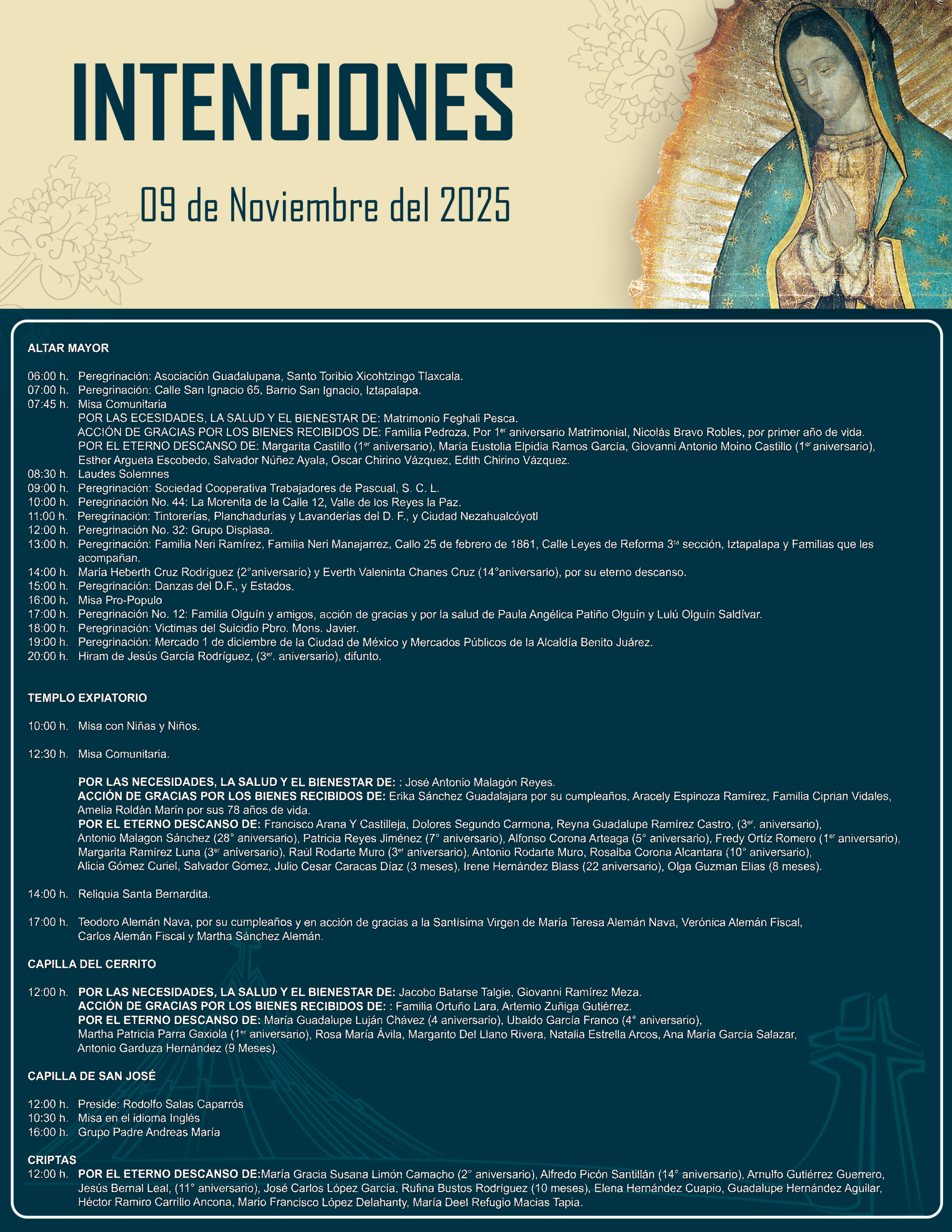 Se anotan misas de Peregrinación, Misas de Acción de Gracias y Difuntos, Ceremonias de Matrimonio, XV años, (Primera Comunión y Presentación, únicamente en la capilla de San José)