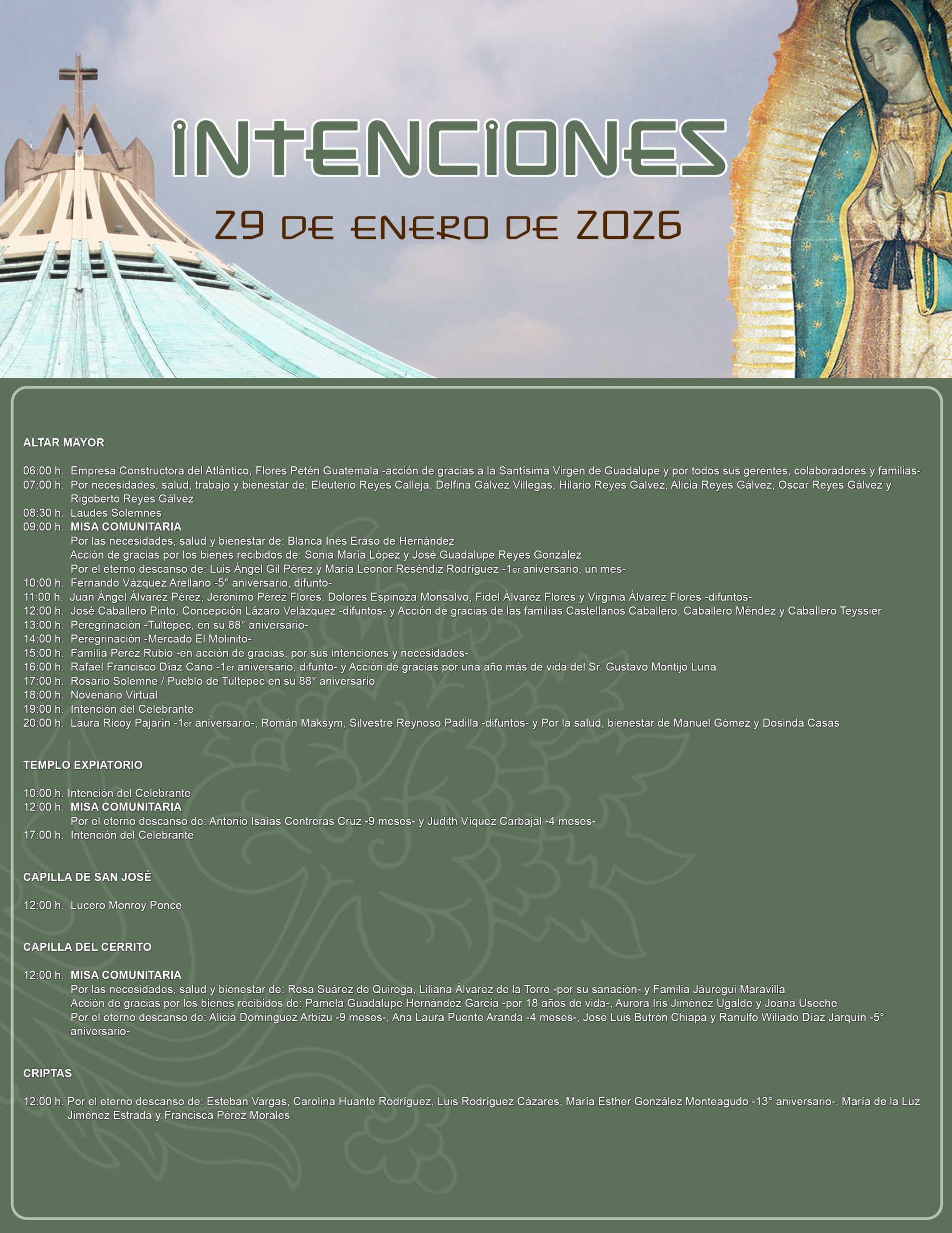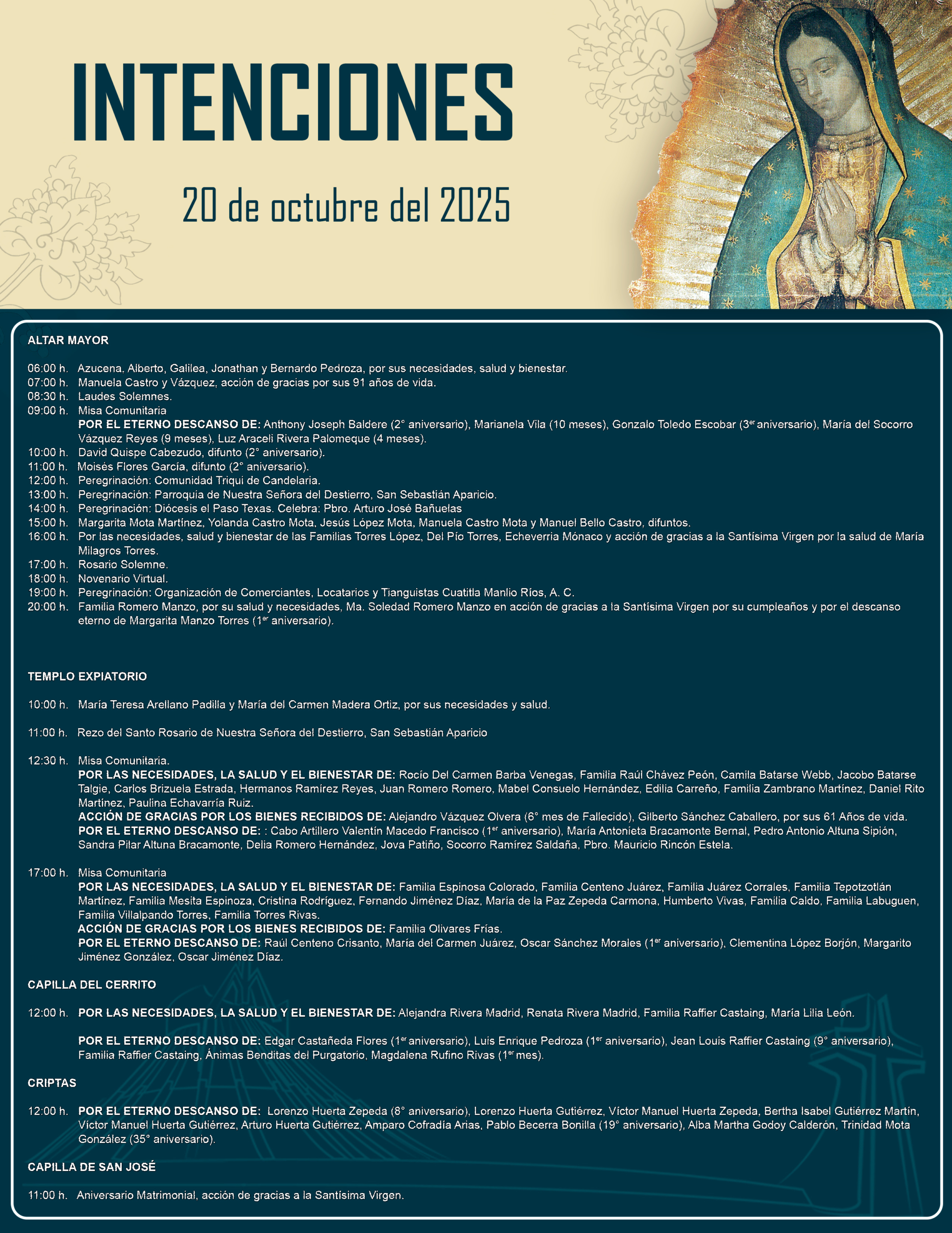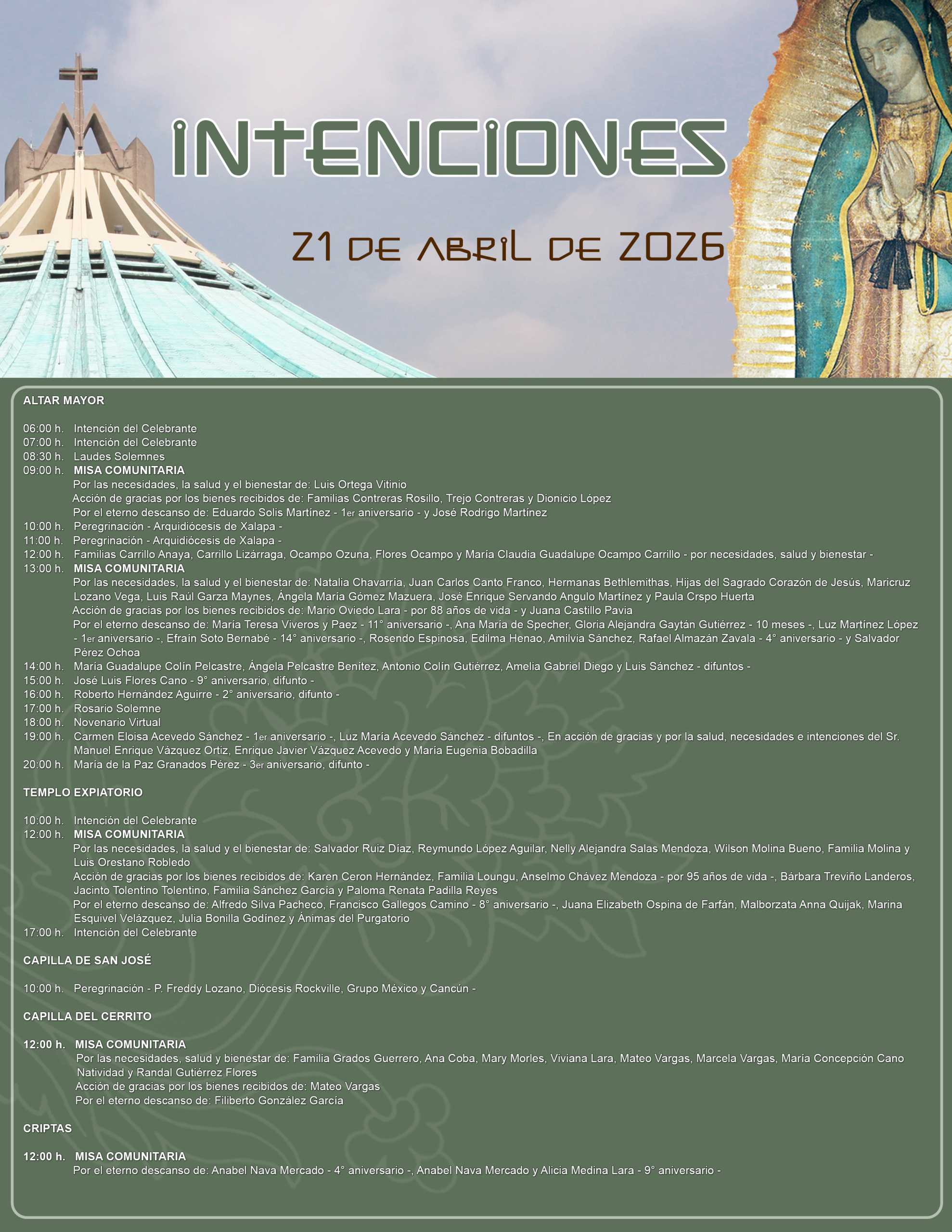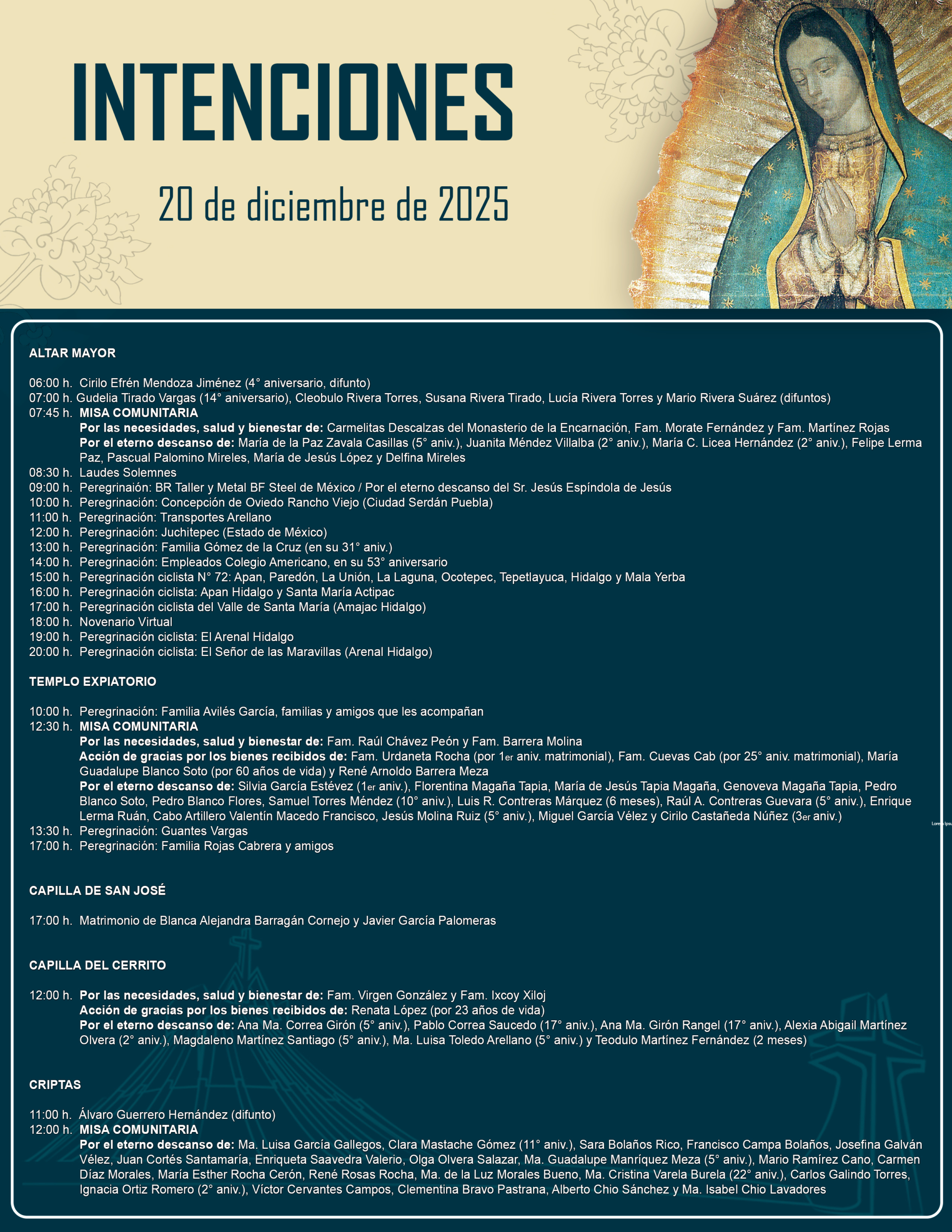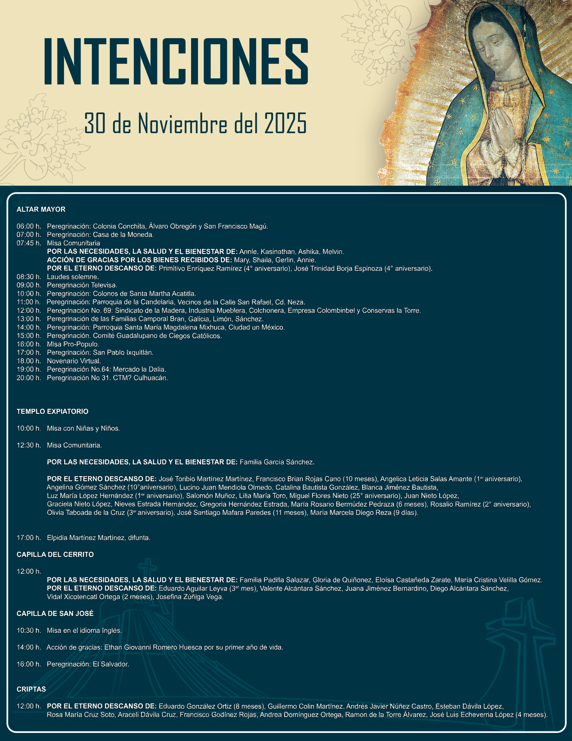 Se anotan misas de Peregrinación, Misas de Acción de Gracias y Difuntos, Ceremonias de Matrimonio, XV años, (Primera Comunión y Presentación, únicamente en la capilla de San José)