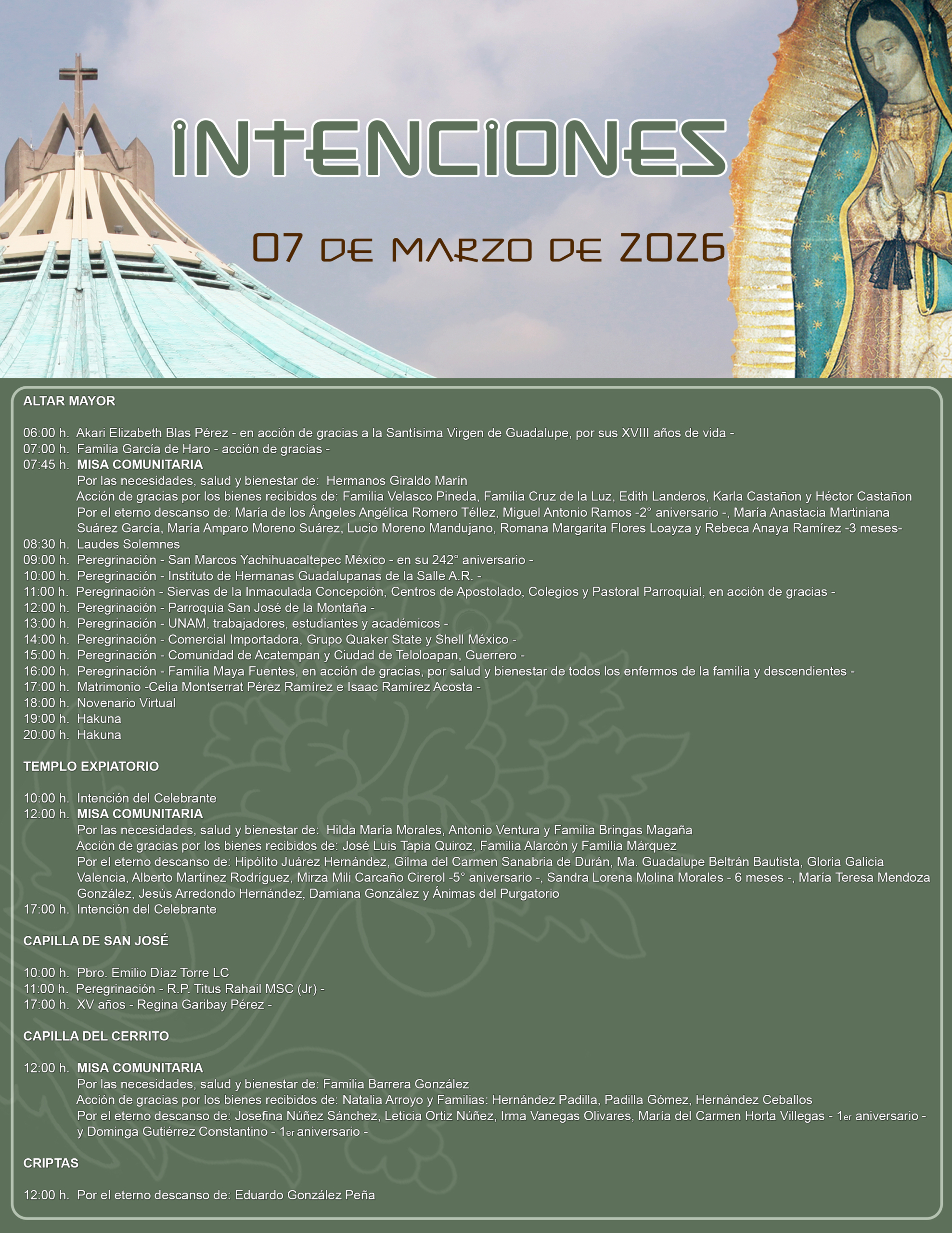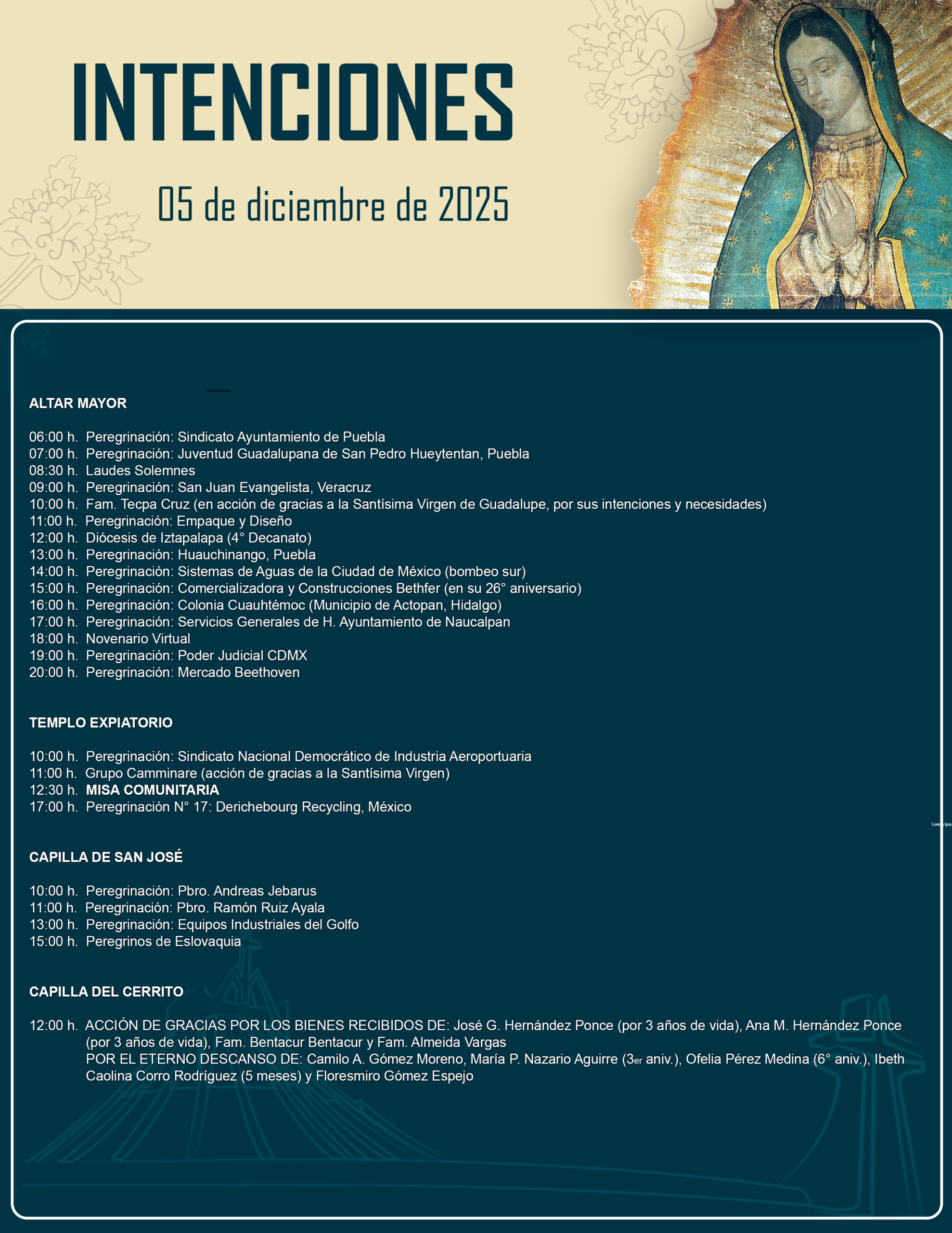 Se anotan misas de Peregrinación, Misas de Acción de Gracias y Difuntos, Ceremonias de Matrimonio, XV años, (Primera Comunión y Presentación, únicamente en la capilla de San José)